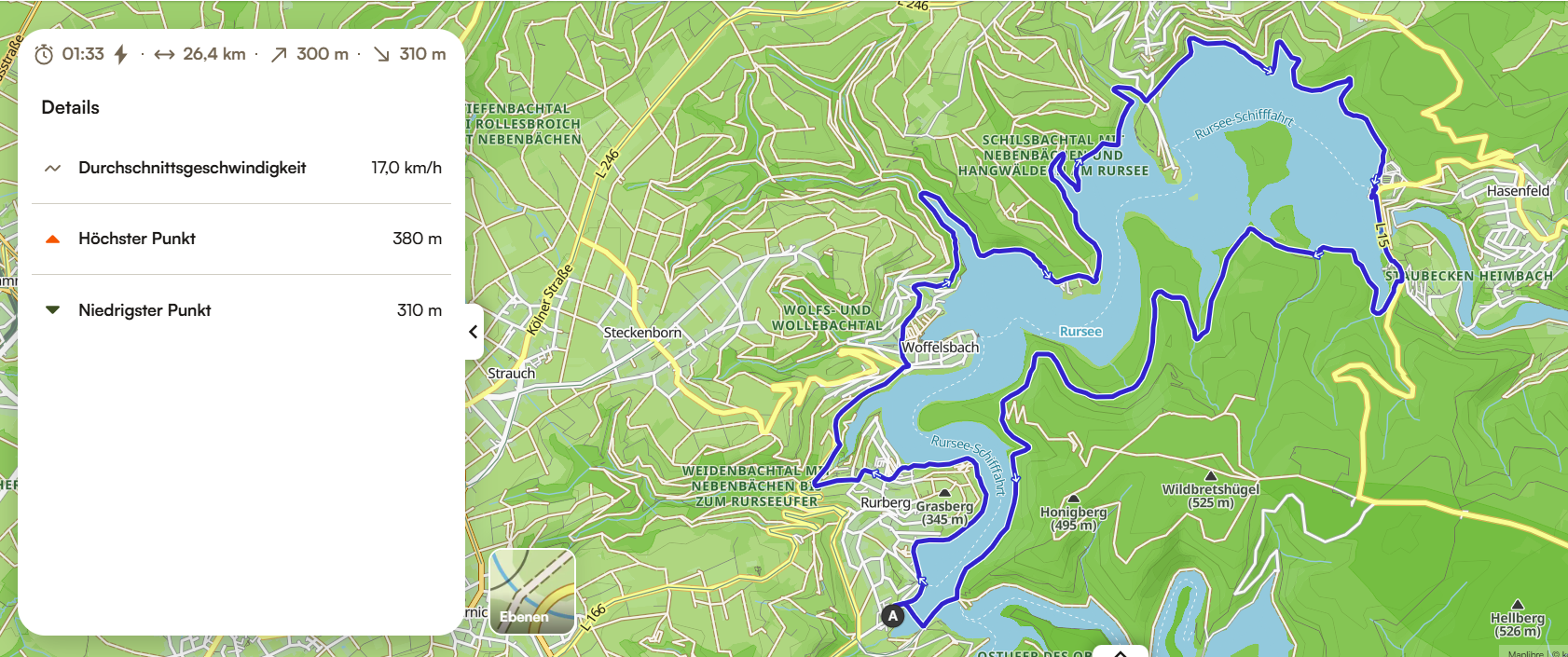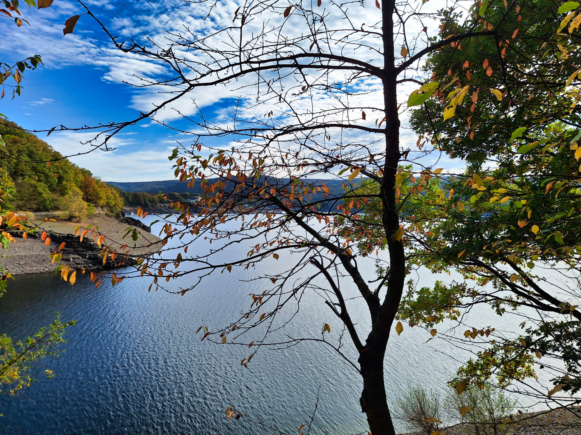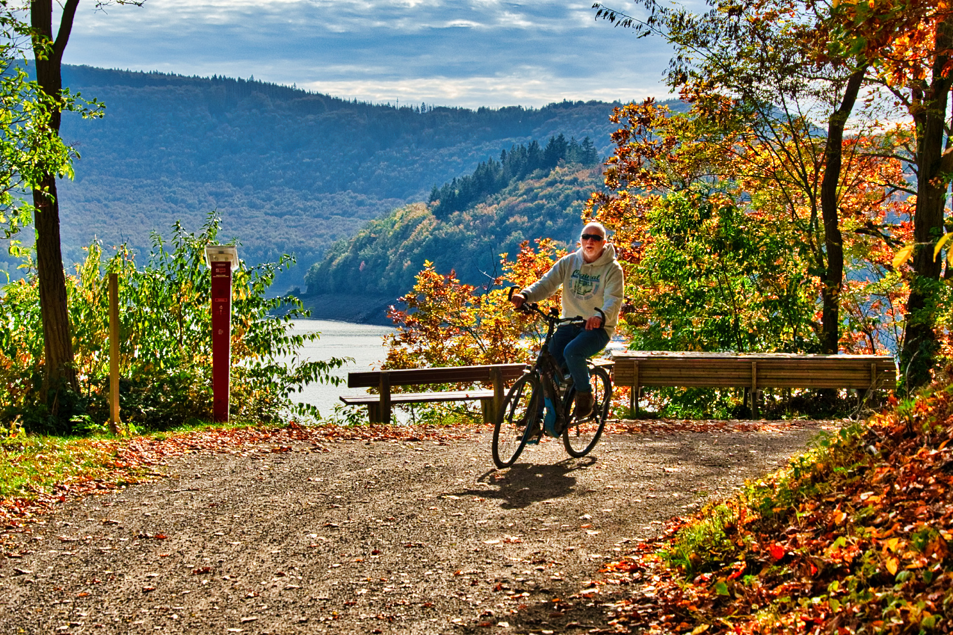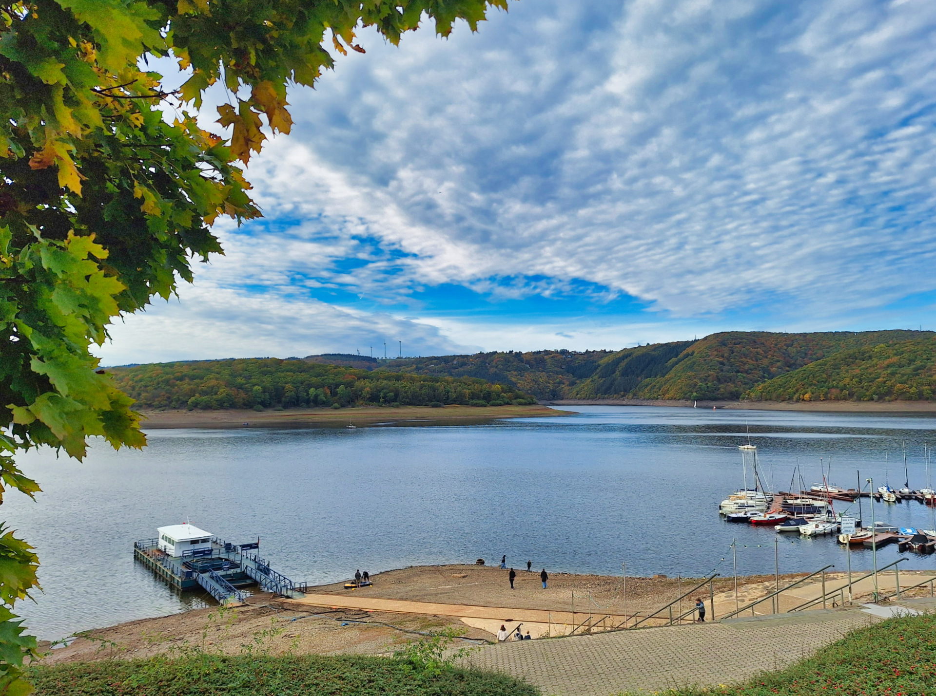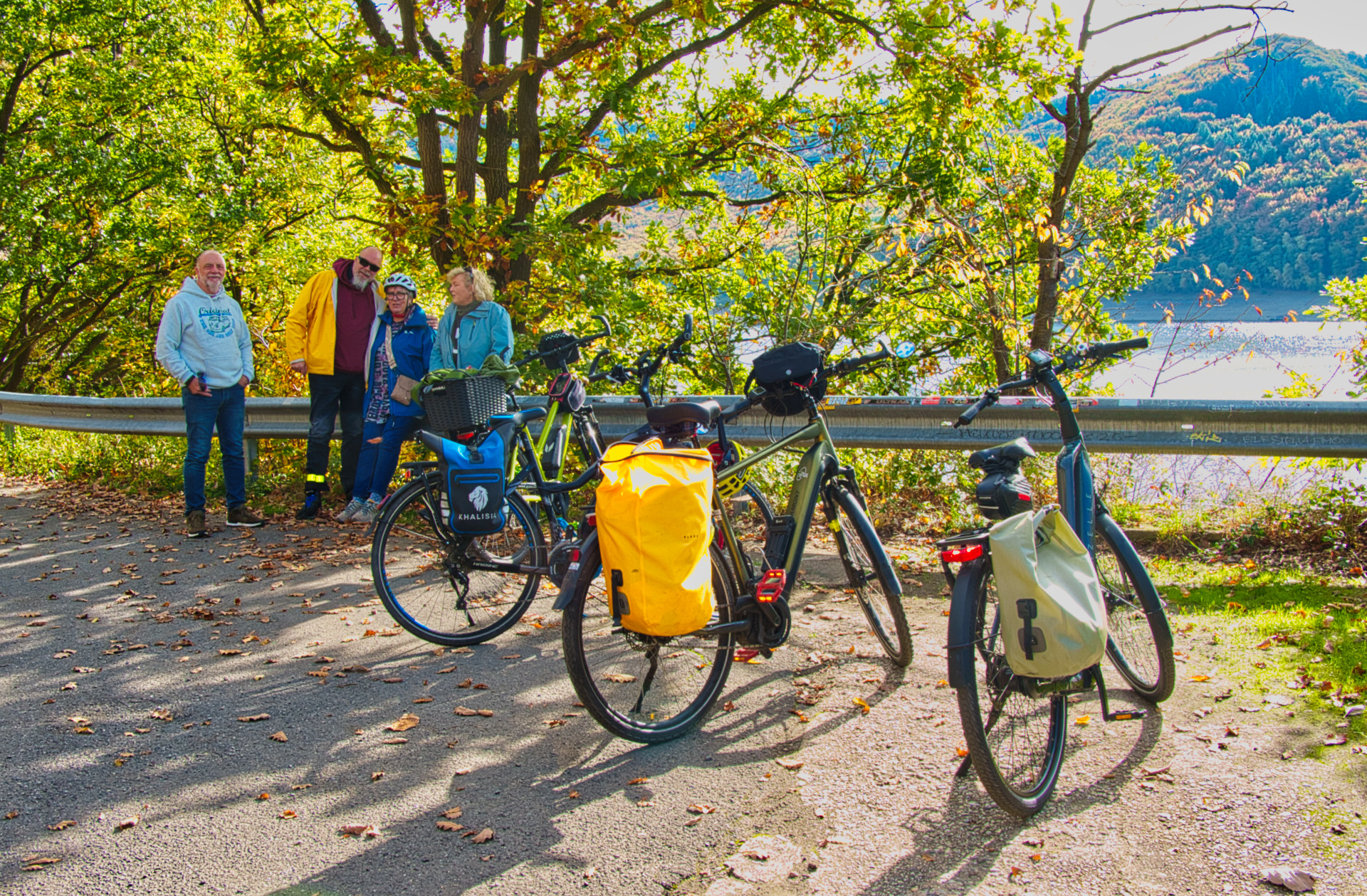 Heute waren wir mit Ingrid und Andreas am Rursee. Mit den E-Bikes ging es eine Runde um den See. Wir starteten in Rurberg und legten einen Zwischenstopp in Schwammenauel ein. Latte Macchiato, Ayurveda-Tee, Heiße Schokolade ohne Sahne, dazu eine Bockwurst mit Brot, eine Currywurst mit Pommes und ein Krokantbecher sorgten für gute Laune.