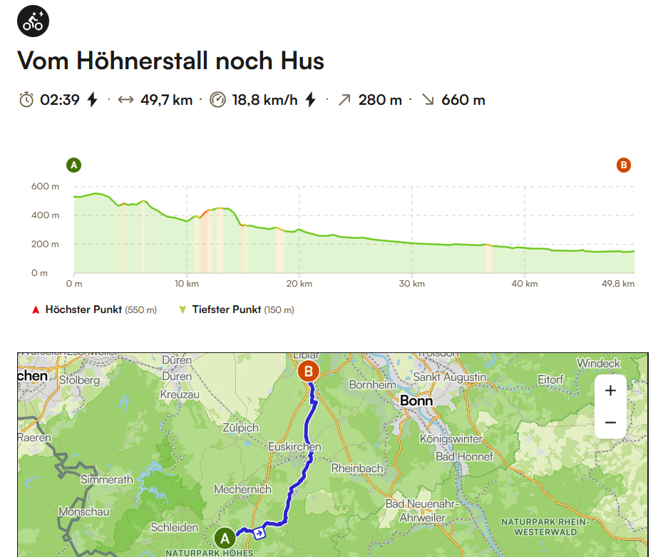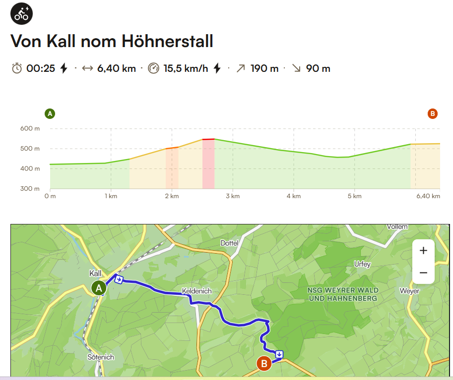 Mit der Bahn ging es von Erftstadt über Weilerswist, Euskirchen und Mechernich nach Kall. Dort kämpften wir erst einmal, wie immer, mit Komoot. Irgendwann fanden wir den Weg dann doch und quälten uns über Keldenich zum Höhnerstall. Es sollten keine sechs km sein, entspannt mit dem E-Bike. Es fühlte sich an, wie der Schlussanstieg zum L’Alpe d’Huez.