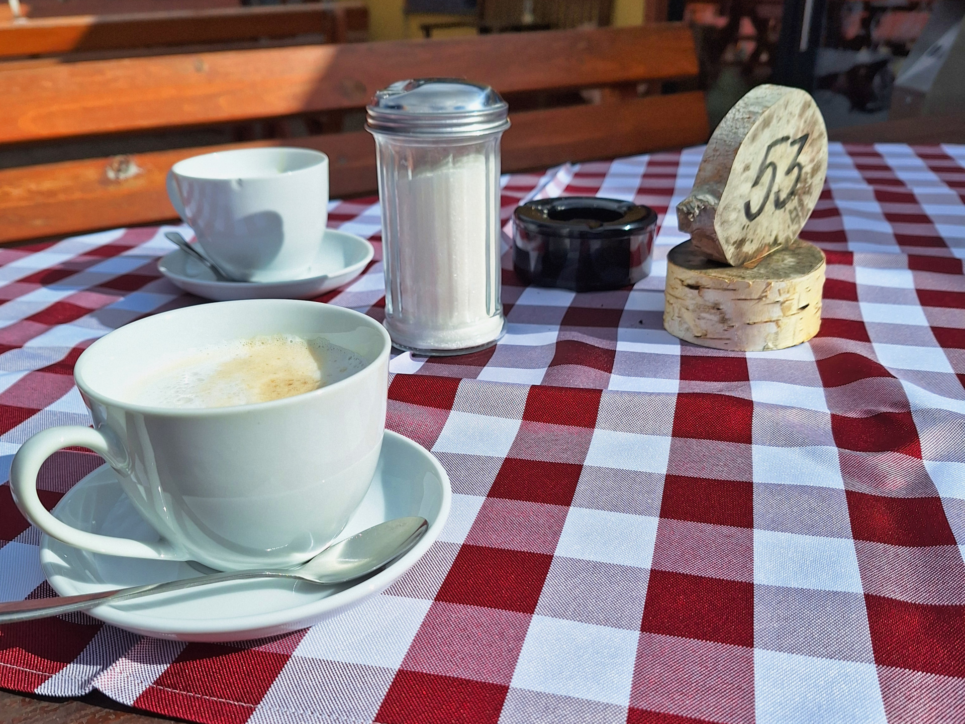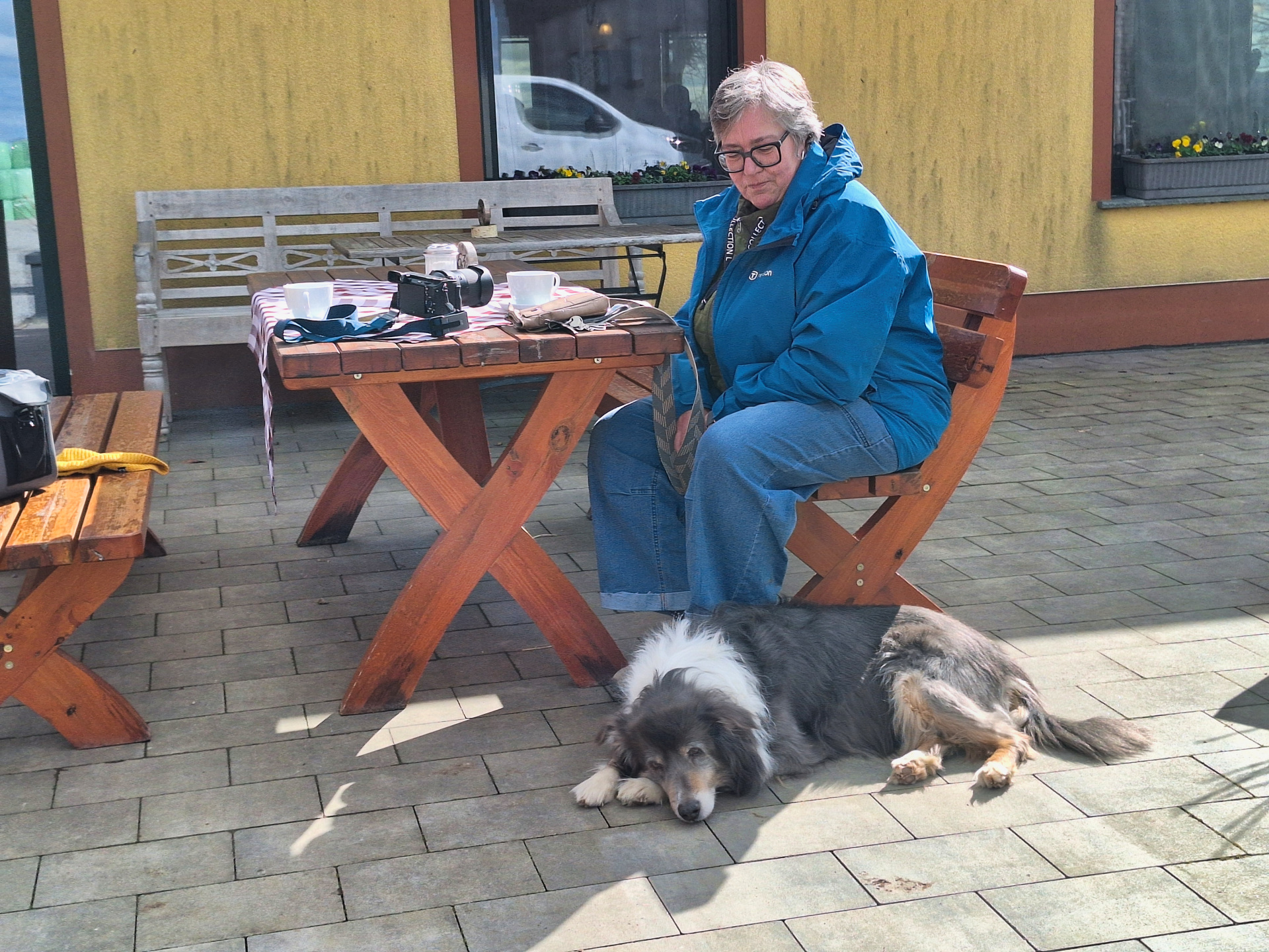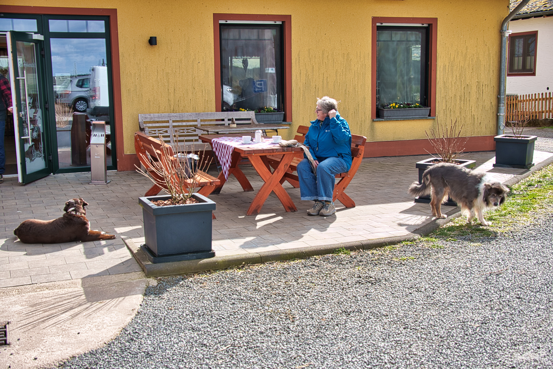 Irgendwann erreichten wir dann den Höhnerstall. Es gab einen leckeren Milchkaffee von einer freundlichen Bedienung und einen zutraulichen Border-Collie, der sich gerne am Bauch in der Sonne kraulen ließ.